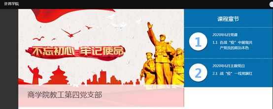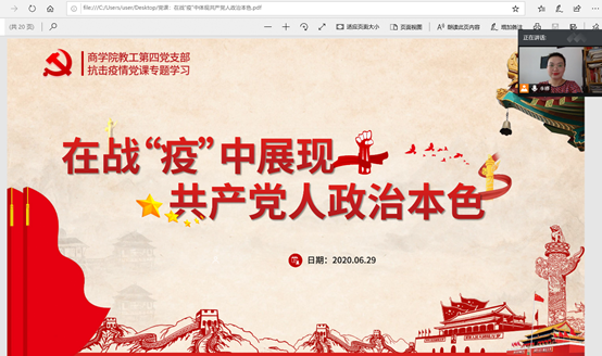 6月29日,商学院教工第四党支部在“云端”开展了“牢记初心使命、争当出彩先锋”主题党日活动,向党的99周岁生日送上祝福。教工第四党支部通过腾讯会议直播平台和学习通组织开展了一次特殊的“线上”支部主题党日活动。活动由支部书记李娜主持,教师党员如约参加了线上活动。