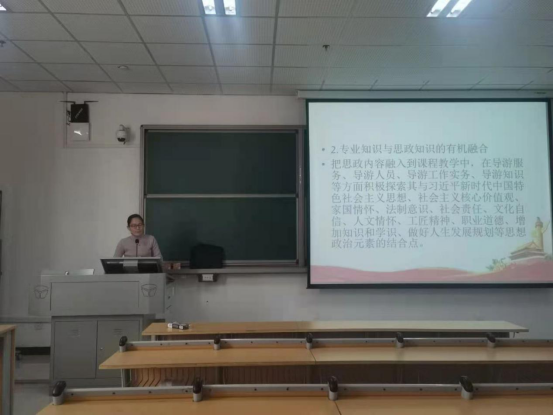 在汇报会上,教务处吴迪副处长就举行此次活动的意义和目的为大家做了介绍,希望大家抓住这次难得的学习机会,交流学习,为课程思政的深入进行奠定基础。四位老师就自己在课程思政过程中的做法从建设思路、建设措施及主要做法、获得的成果和不足及改进等四个方面进行了汇报。汇报中,不仅学习了其他老师在课程思政中的有益做法,比如创建课程抖音号,让学生录制相关的课程思政的小视频,线上课程结合的建设等;更为大家拓展了今后开展课程思政的思路。