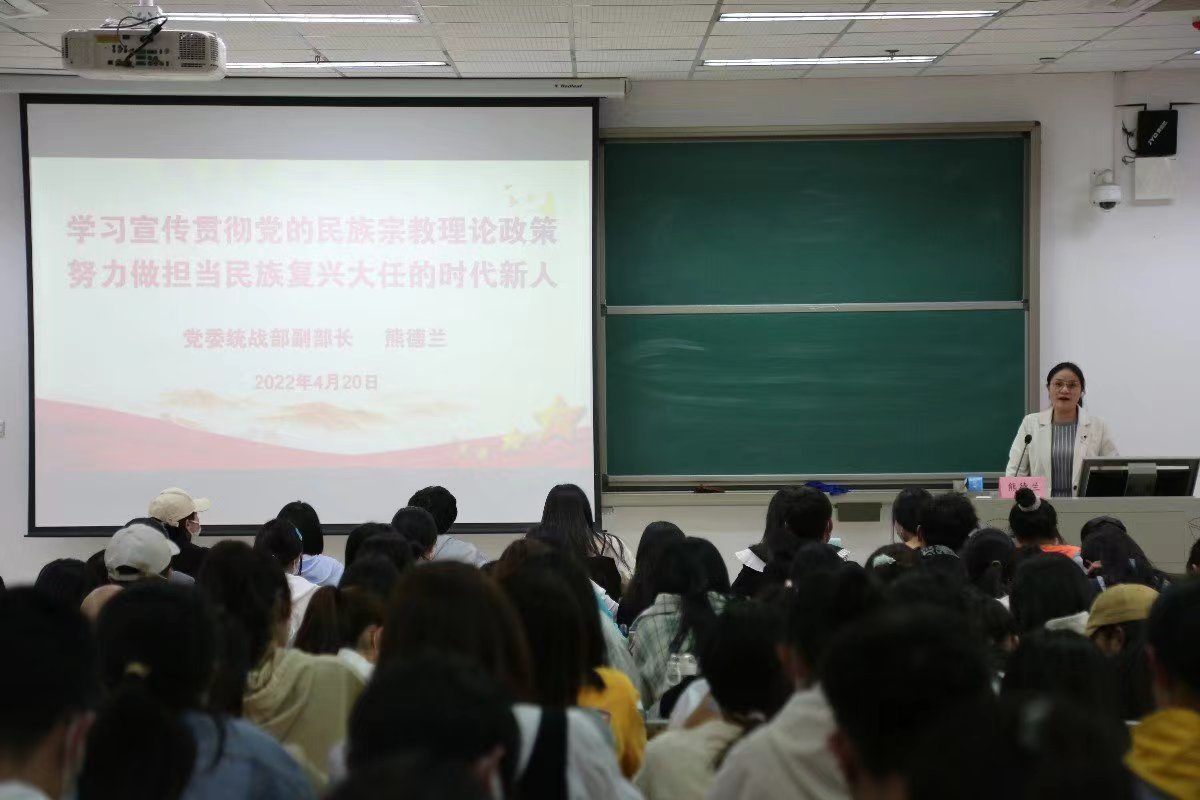 熊部长以《学习宣传贯彻党的民族宗教理论政策,努力做担当民族复兴大任的时代新人》为题,从民族理论与政策、马克思主义宗教观和党的宗教政策、有关法律法规、如何践行党的民族宗教理论政策四个方面展开讲授,引导学生深入学习习近平总书记关于加强和改进民族工作的重要思想,了解宗教在我国社会主义时期的特征,充分铸牢学生的中华民族共同体意识,加强马克思主义宗教观,明确中华民族共同体意识。