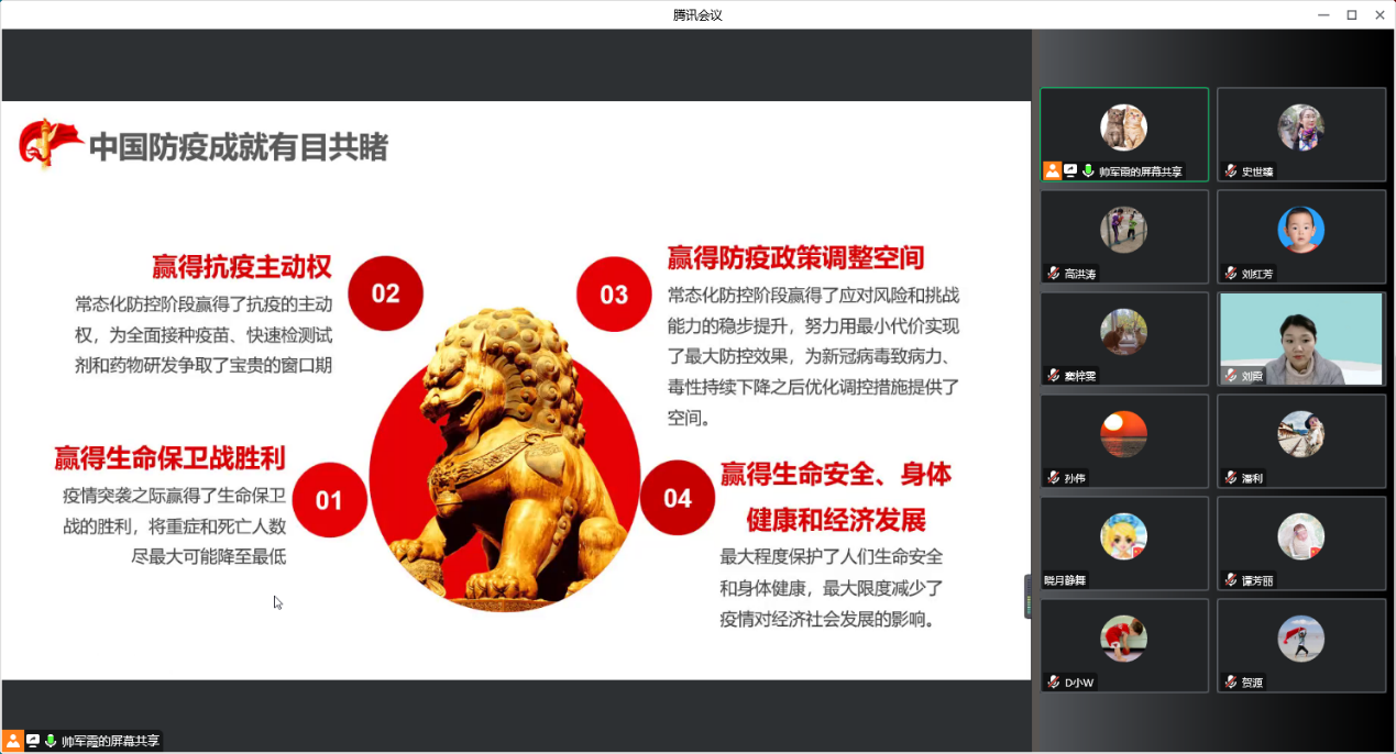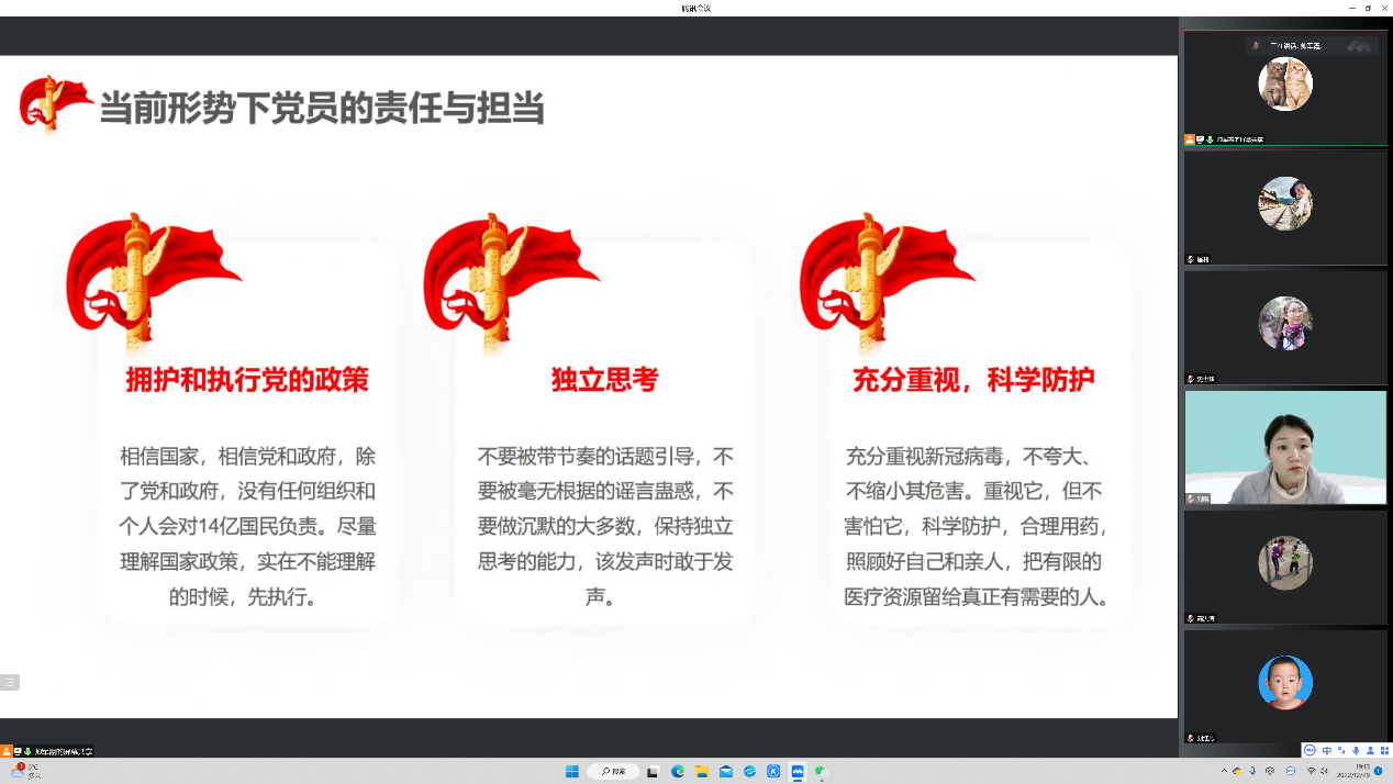 当前,我国疫情防控政策作出了一系列调整,12月7日国务院联防联控机制综合组发布《关于进一步优化落实新冠肺炎疫情防控措施的通知》,优化各类防控措施,强调精准防控。12月26日,国家卫生健康委员会发布公告,将新型冠状病毒肺炎更名为新型冠状病毒感染,并对新型冠状病毒感染实施“乙类乙管”。一系列政策的调整标志着我国疫情防控进入新阶段,面临新形势、新任务,工作重心从“防感染”转向“保健康、防重症”。防疫政策的调整需要每一位公民的理解和配合,为了让党员老师更好理解各项政策,更好体现当前形势下党员的责任与担当,12月29日,我院第五教工党支部采取线上形式召开主题党日学习活动——“科学防护,做好自己健康的第一责任人”。会议由支部书记刘霞同志主持。