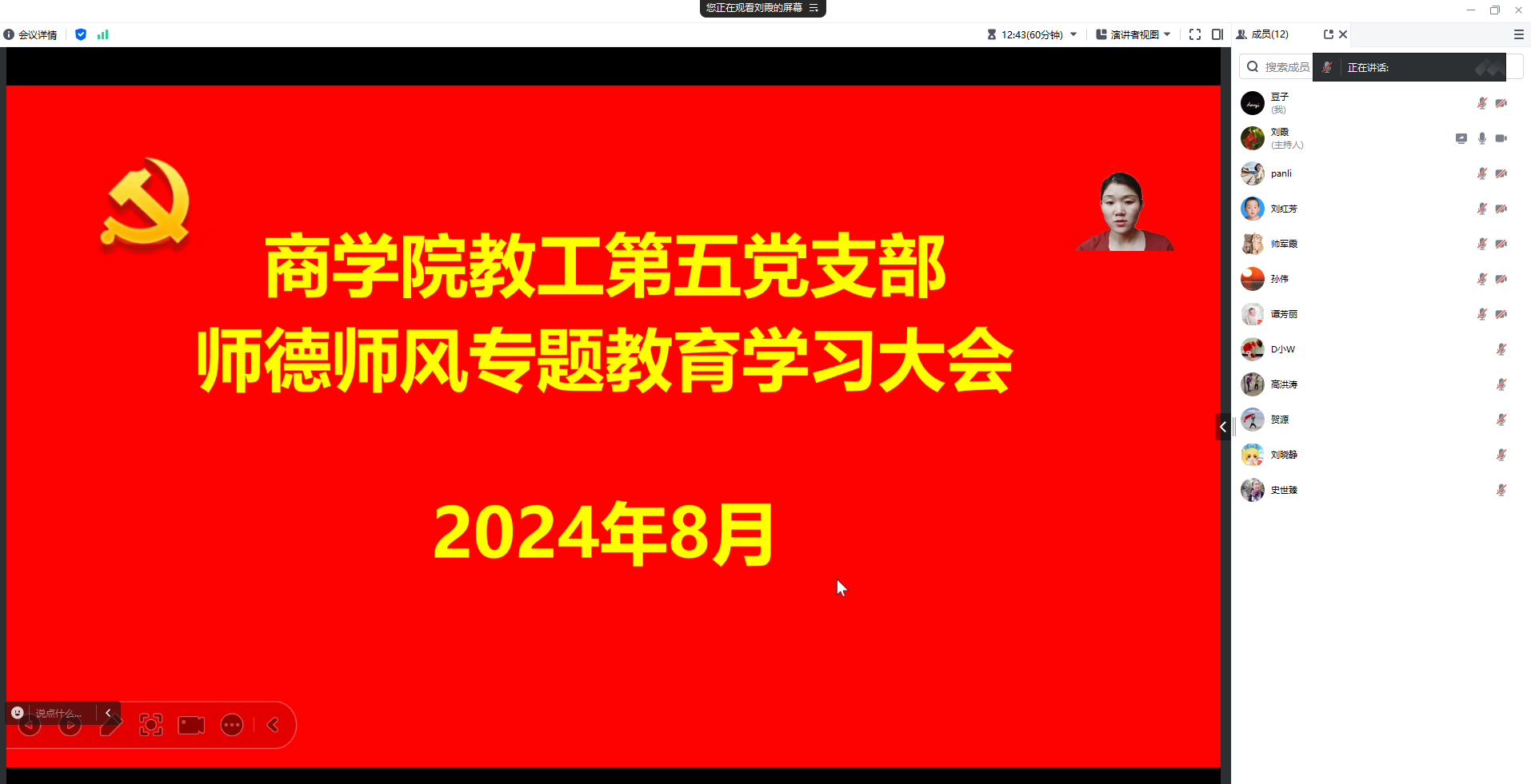 根据学校《关于印发中共许昌学院委员会关于进一步压实师德师风建设主体责任实施办法(试行)的 通知》及商学院党委要求,我院教工第五党支部于2024年 8月8日上午召开师德师风专题教育学习主题党日活动。活动采取线下自学和线上集中学习的方式,由支部书记刘霞同志主持并传达,支部全体党员参加。