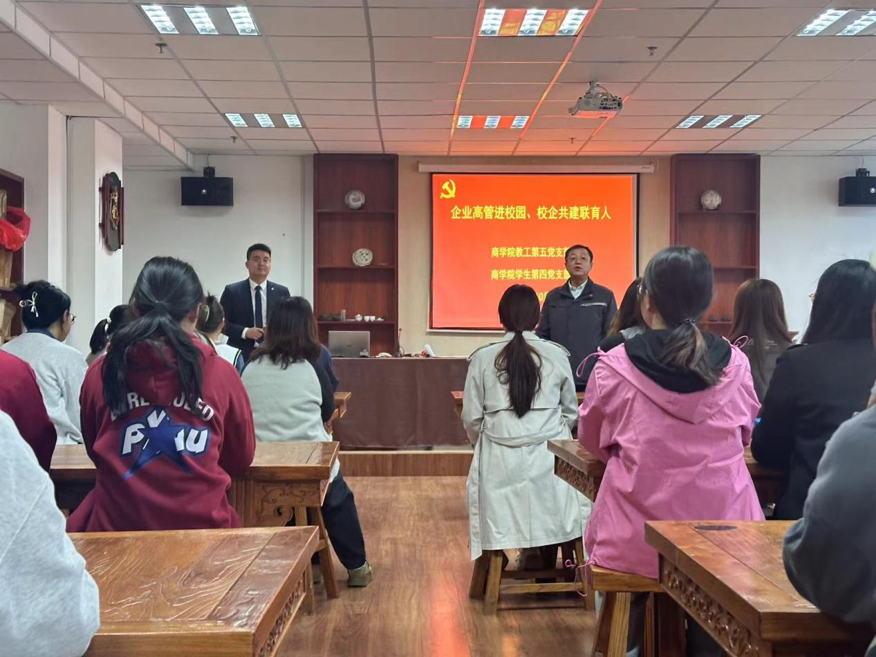 2024 年 10 月 22 日下午,商学院教工第五党支部与学生第四党支部在E-918举行“企业高管进校园,校企共建联育人”的联合主题党日活动。此次活动特别邀请了日照开元森泊度假乐园人力资源总监单磊担任主讲嘉宾,教工第五党支部全体党员老师和学生第四党支部的党员老师学生和入党积极分子参加。活动由商学院党委副书记海泳主持。