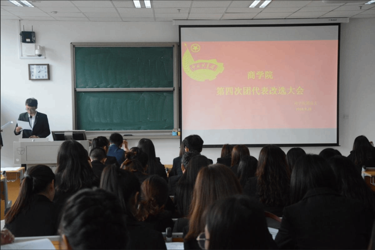 2018年9月28日中午十二点三十分,商学院第四次团代表改选大会在文科综合楼606教室准时召开。本次会议由团总支学生会社团管理部部长赵文韬主持,商学院团总支书记张志豪和众团代表参加了本次会议。