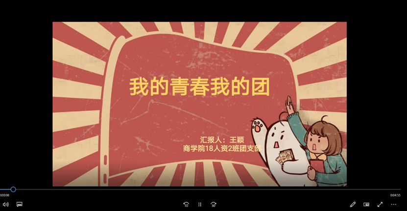 在此次比赛中,18人力资源管理2班团支部将PPT与视频结合,并配以解说,从不同角度展现了班级团支部的风采。比赛前,经过团支部全体成员的讨论,决定将视频作品内容分为四个部分:“团支部简介”、“青春起点:支部建设”、“前进道路:组织建设”、“展望未来:国之栋梁”。在视频作品中,通过这四个部分,汇报人王颖介绍了团支部的情况,回顾了团支部的过往,讲述了团支部的建设,展望了团支部的未来。除此之外,作品中同时穿插了团支部成员录制的朗诵视频以及手势舞视频,以独特的形式充分体现了团支部成员的别样风采。