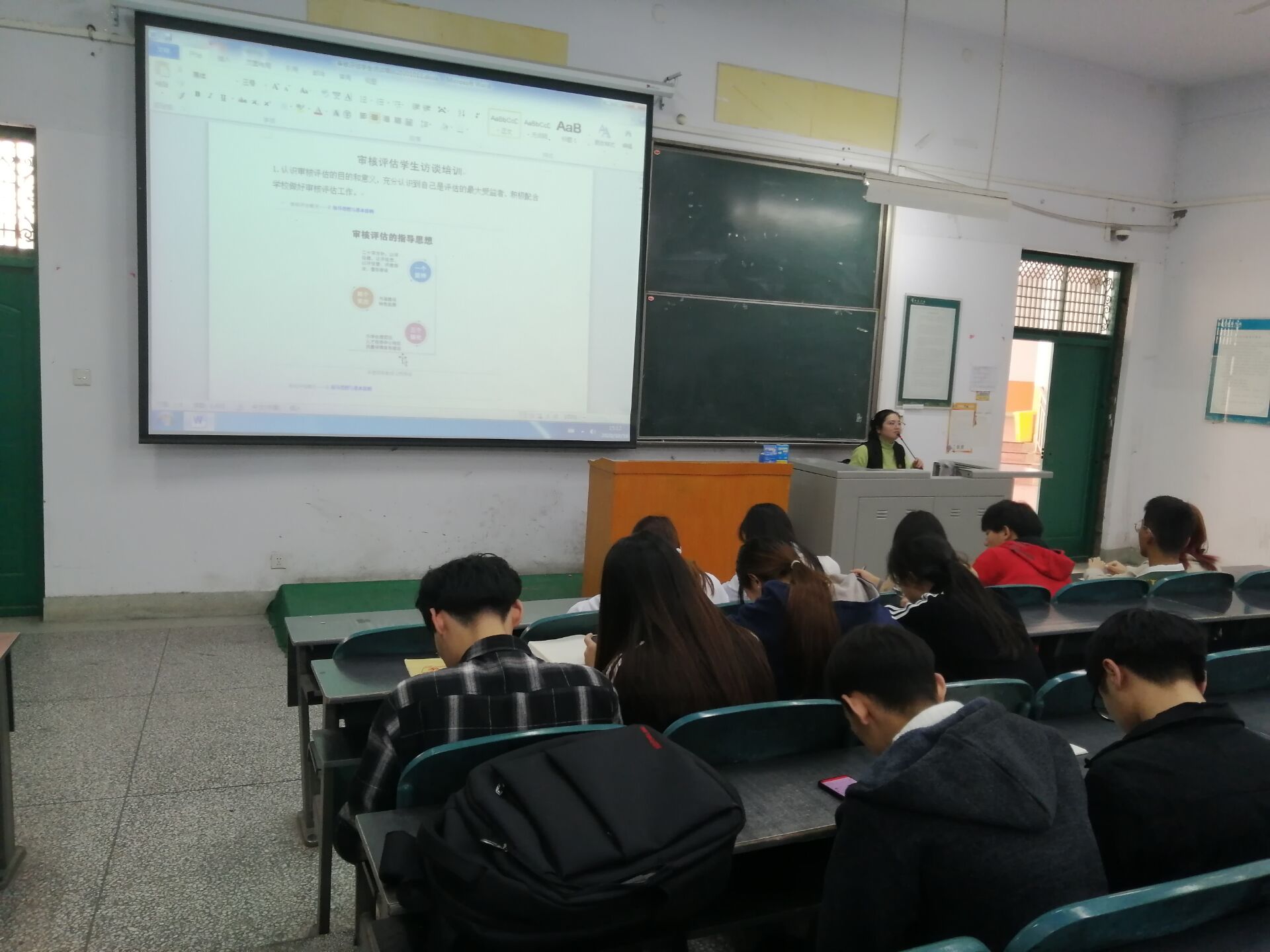 培训过程中,谭老师从学校概况、学校指导与服务工作的满意程度以及学生应该怎样积极参与学校的迎评工作三个大方面向同学们进行培训,同时讲解了审核评估的指导思想和基本原则。紧接着,谭老师从教师数量与结构、教学设施、校企合作、学生指导与服务、学风建设等方面切入,为大家详细讲述了学校的教学建设。最后,谭芳丽老师倡导大家应时刻保持文明举止,讲究个人卫生,认真阅读学校发放的本科教学审核学习资料,积极配合学校的评估工作。