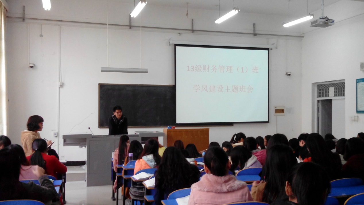 为了让大家有建立良好学风的主人公意识,充分调动大家的积极性,2015年11月13日上午,13级财务管理一班在c-108教室召开关于“学风建设”的主题班会,班长贾玉建和团支书李思婕主持,13级财务管理一班全体成员参加了此次班会。