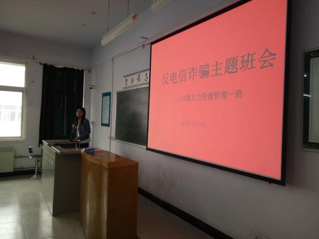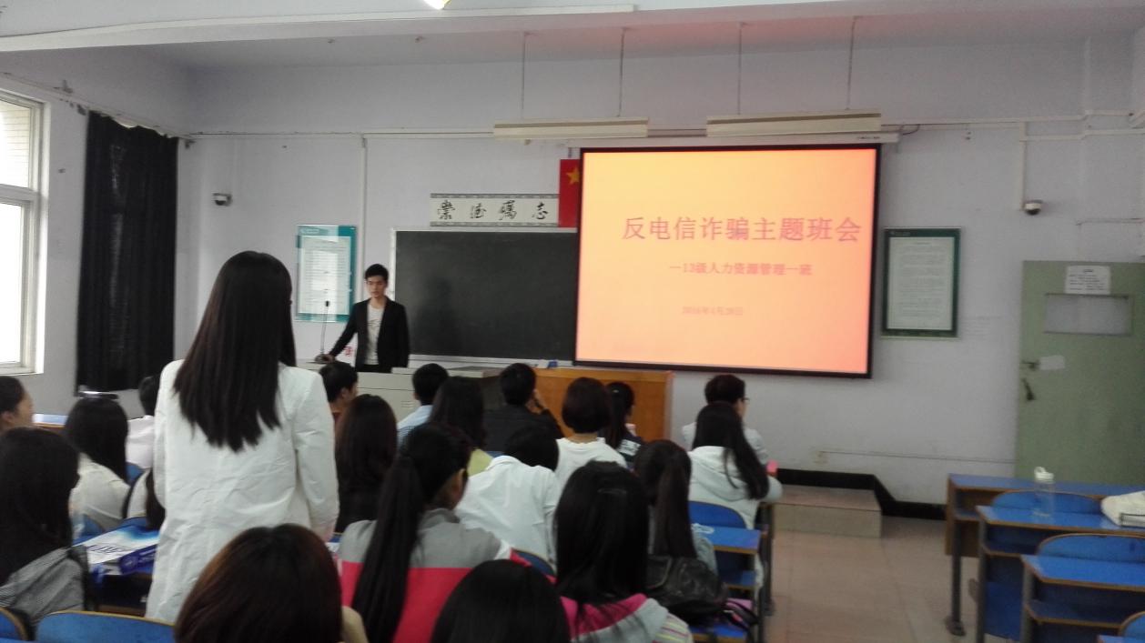 随着科学技术的发展,诈骗由传统的单一形式向电信化转变,诈骗形式越来越新颖,识别难度越来越高。近日来,我校频频发生电信诈骗案件。面对越来越猖獗的电信诈骗,响应学校、院系的提高安全意识的号召,商学院13级人资一班于4月28日在C座教学楼504教室举行“防电信诈骗”的主题班会,旨在时时敲响防诈骗的警钟,提高同学们的自保护能力。