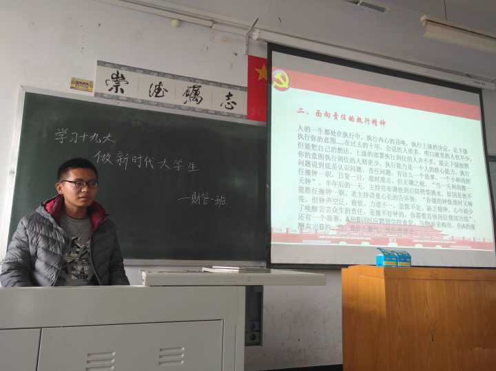 为了更好的贯彻十九大精神,做新时代大学生,财管一班团支部于12月1日14:00在C-403教室组织召开了关于学习十九大精神的主题班会。班会主持人由财管一班团支书姚壮担任,财管一班全体学生参加了此次班会。
