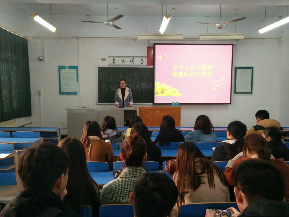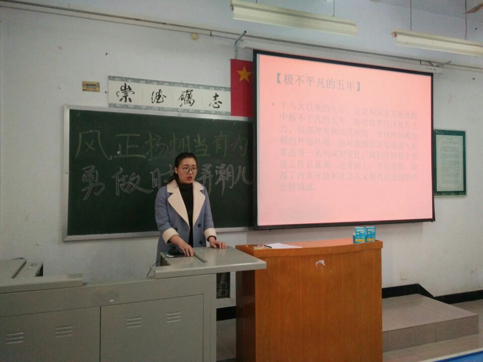 为进一步加强学生的政治思想观念,增强对十九大精神的深刻认识,明晰自身的责任和使命,16级工商管理一班于12月1日下午二时在C楼303教室开展了以“学习十九大精神,做新时代大学生”为主题的团日活动。本次活动由团支书贺丽媛主持召开,班级全体成员到场参加。