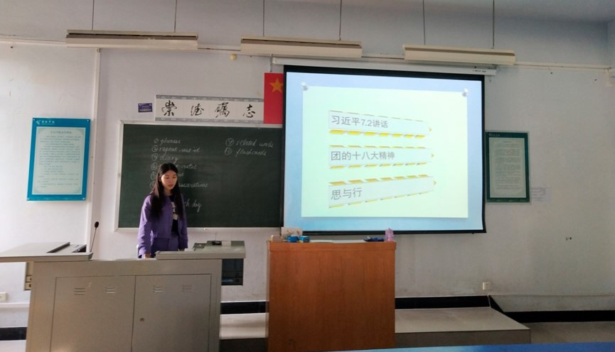 本次活动分为三块内容,首先主持人章欣悦从党在新时期全部理论和实践的“一个鲜明主题”到理论上不断拓展新视野、作出新概括的“两个新”进行了简单的讲解。接着,从三个“靠”和三个“永无止境”对团的十八大精神进行了解读,同时联系实际,进行了延伸讲解。最后,章欣悦提出了“思与行”这个问题,建议在座的同学们在学习习近平总书记7.2重要讲话和团的十八大精神的过程中要学以致用,思考其深层次的内涵。