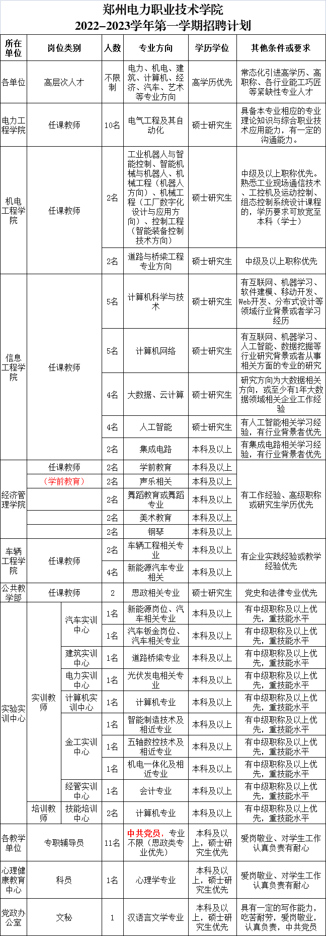 附件:郑州电力职业技术学院2022-2023学年度第一学期招聘计划).docx