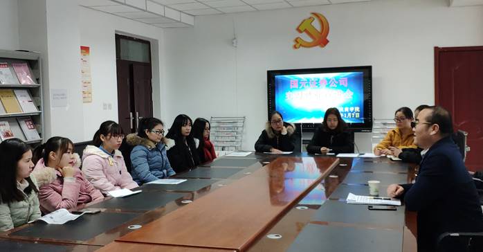 为了做好2019届毕业生的实习就业工作,让同学们了解证券行业的人才需求,2019年1月7日上午9:30和下午3点,我院在文综楼1323会议室分别举办了国盛证券和国元证券公司两场实习就业宣讲会。宣讲会由党总支副书记海泳主持,团总支书记张志豪、就业专干郭少辉以及2015级获得证券从业资格的部分学生参加。