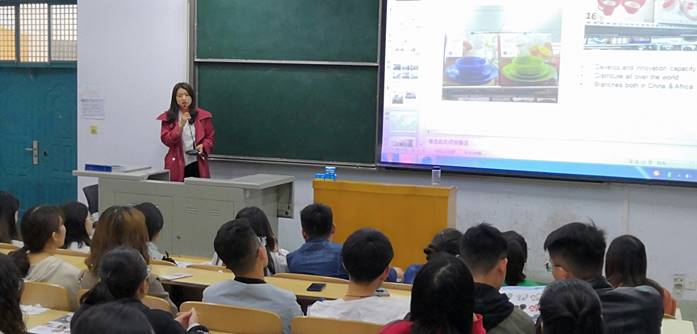 在宣讲会上,同学们浏览了许昌市对外贸易有限公司的宣传册并观看了宣传视频,在对许昌市对外贸易有限公司有了一定了解后,许昌市外贸公司业务总监张阳介绍了公司发展历程、企业文化、公司荣誉、公司产品、市场规模、招聘岗位等方面的内容。
