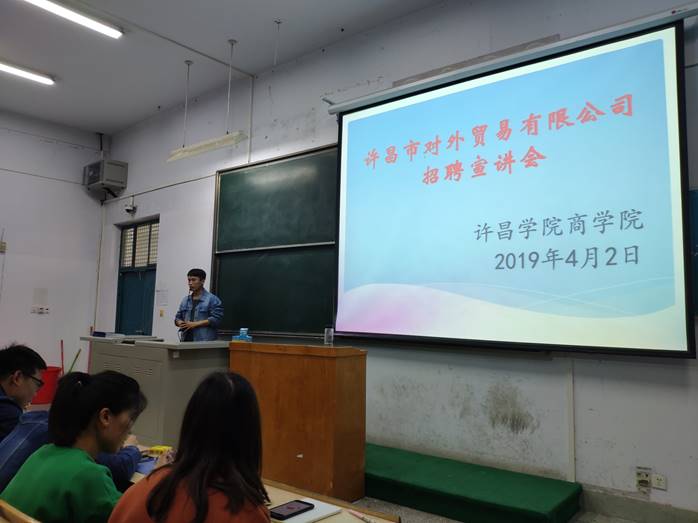 4月2日下午,在B合十五教室,我院举办许昌市对外贸易有限公司招聘宣讲会,辅导员郭少辉老师和2019届人力资源管理专业、行政管理专业、工商管理专业共130余人的同学参加了此次宣讲会。