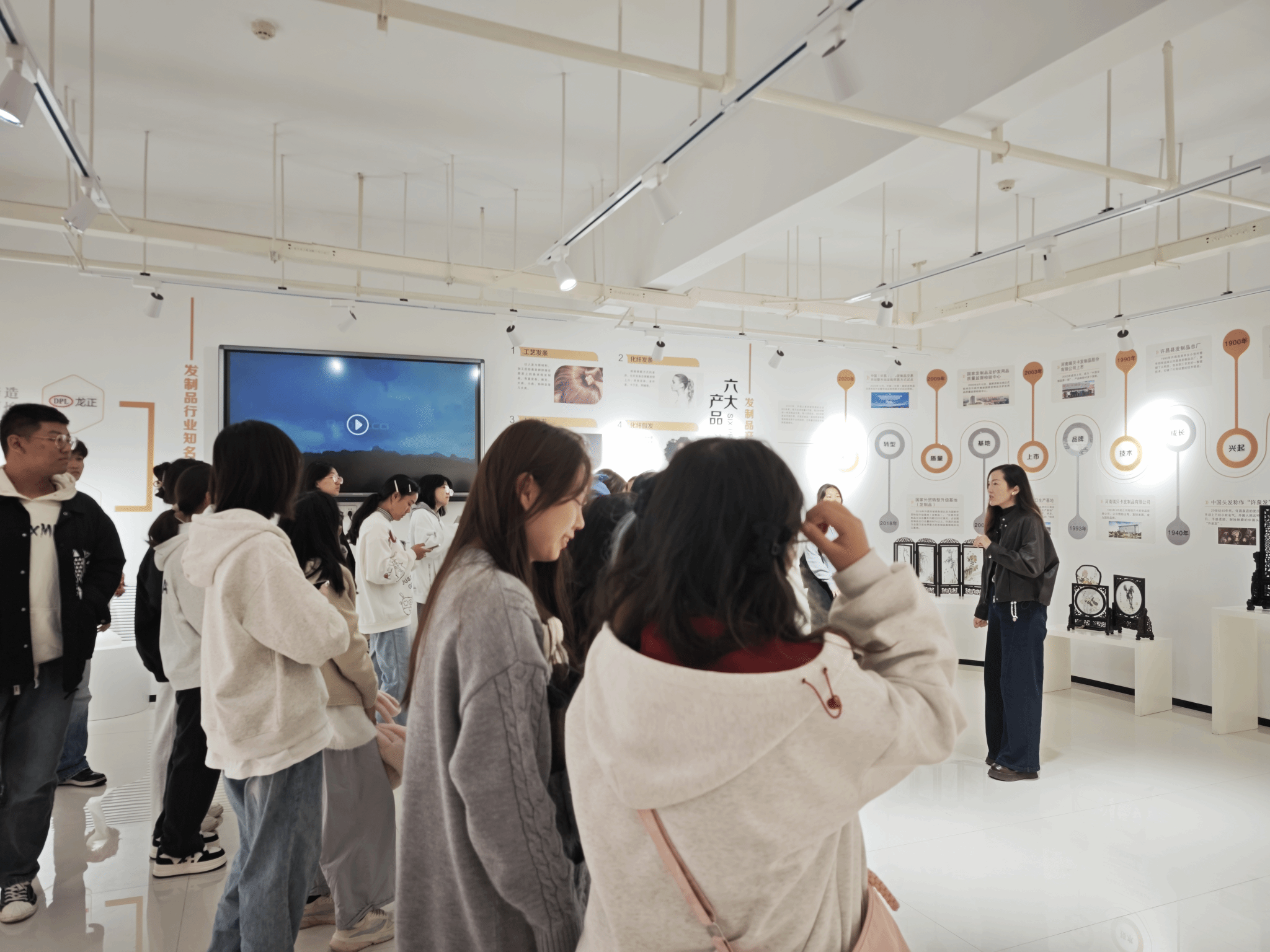 在发制品展厅,同学们认真聆听讲解,系统了解发制品的历史渊源、文化内涵及现代化生产工艺。从传统工艺发绣,到多种工艺的新型发饰,展厅内每一件产品都反映出行业在科技与个性化定制方面的最新发展,吸引了同学们的浓厚兴趣。