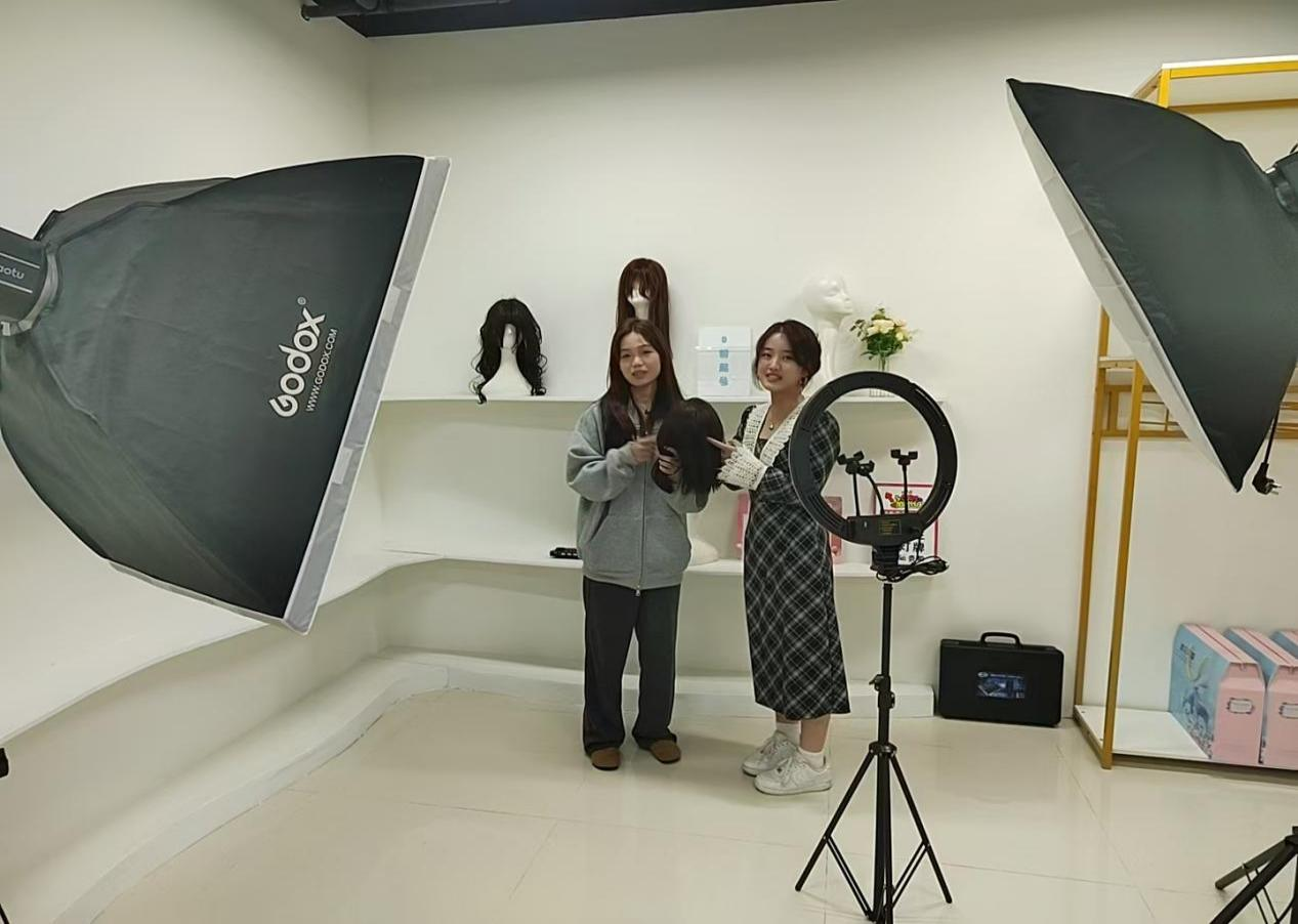 在发制品电商直播间,同学们热情高涨,表示了极大的兴趣。在老师的带领下,很多同学第一次尝试做“主播”,亲身体验了直播卖货的乐趣。大家虽有些生涩,但初步了解了电商直播的流程、技巧等内容。